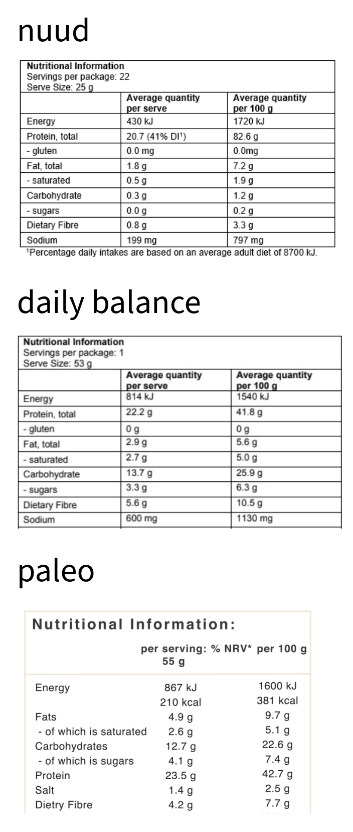 23.5g protein, 4.9g fat, 12.7g carbohydrates, 4.2g of dietary fibre (per 55g serve).